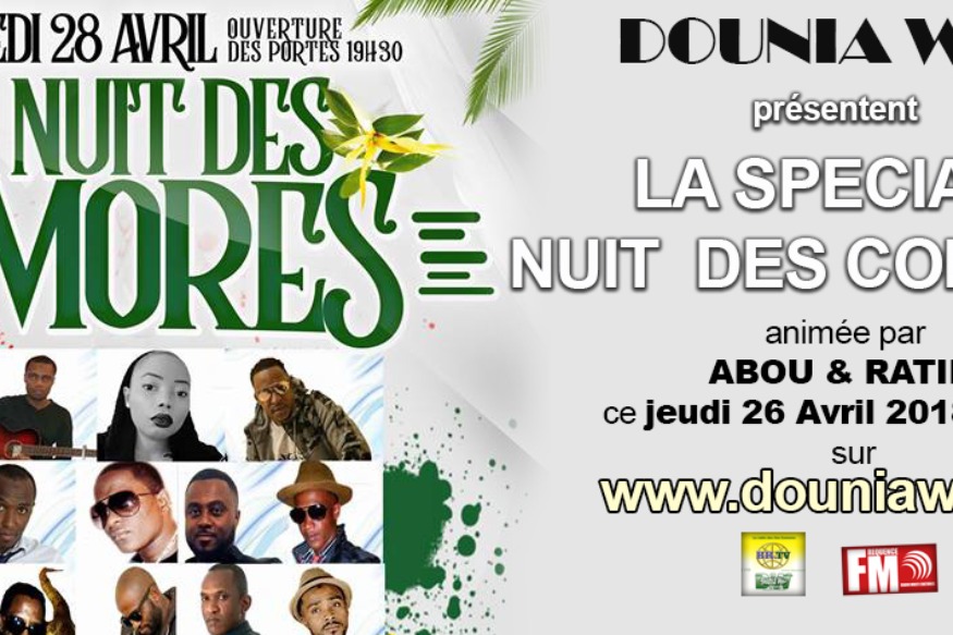 L'équipe de la nuit des comores sont invitée pour nous parler de leur Concert. Ce Jeudi à 16h15 en direct sur La Radio Dounia Web. Pour participer, vous pouvez nous contacter 07.51.96.52.28