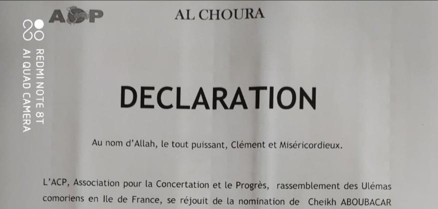 L'Association pour la Concertation et le Progrès (ACP), rassemblement des Ulémas comoriens en île-De-France a fait une déclaration pour la première fois depuis la nomination du nouveau Grand Mufti de la République Aboubar SAid Abdillah, successeur du feu Mufti Said Toihir Maoulana de Ntsudjini décédé récemment en avril dernier.
