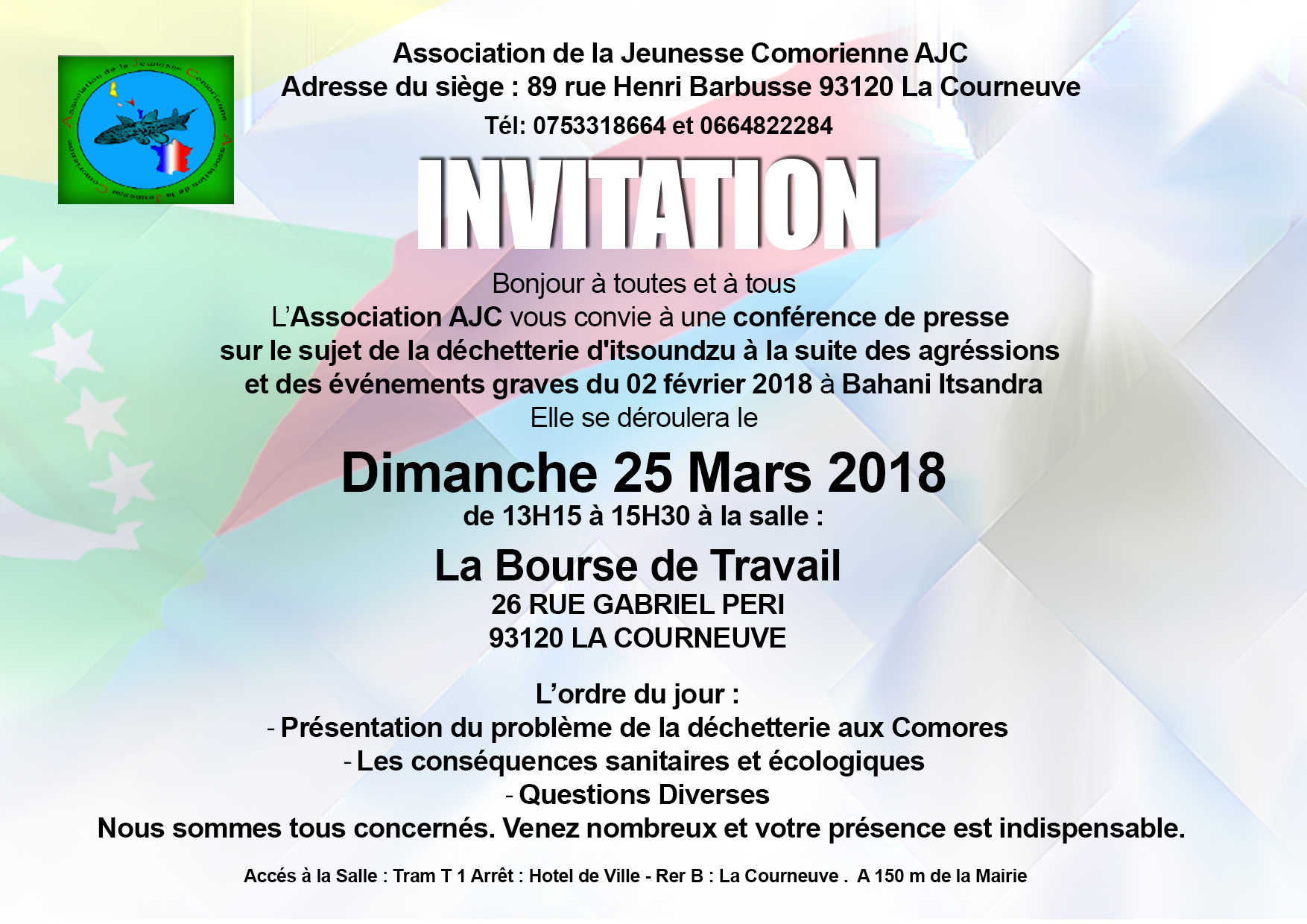 L’Association AJC vous convie à une conférence de presse sur le sujet de la déchetterie d'itsoundzu à la suite des agréssions et des événements graves du 02 février 2018 à Bahani Itsandra Elle se déroulera le Dimanche 25 Mars 2018 de 13H15 à 15H30 à la salle : La Bourse de Travail 26 RUE GABRIEL PERI 93120 LA COURNEUVE
