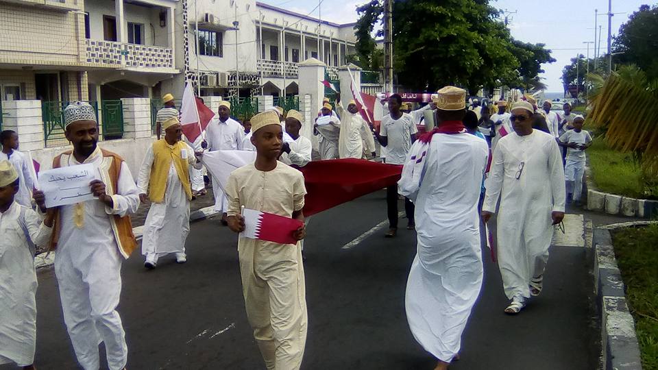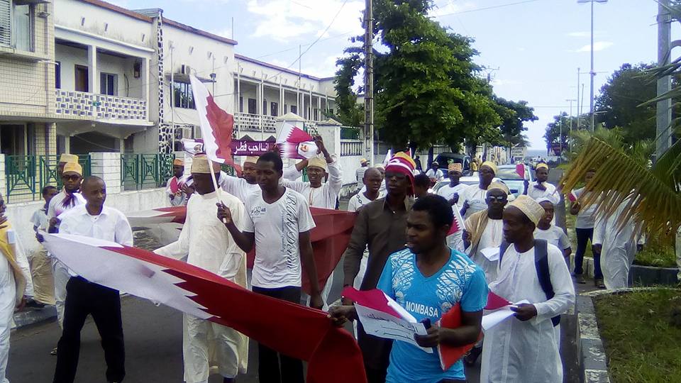Des manifestants sont descendus dans la rue pour montrer leur mécontentement par rapport à la position des Comores suite à la rupture diplomatique avec le #Qatar. Certains crient :"Le qatar c'est la Mère nourricière des Comores , des emplois risquent de se fermer ...que font nos autorités !!!