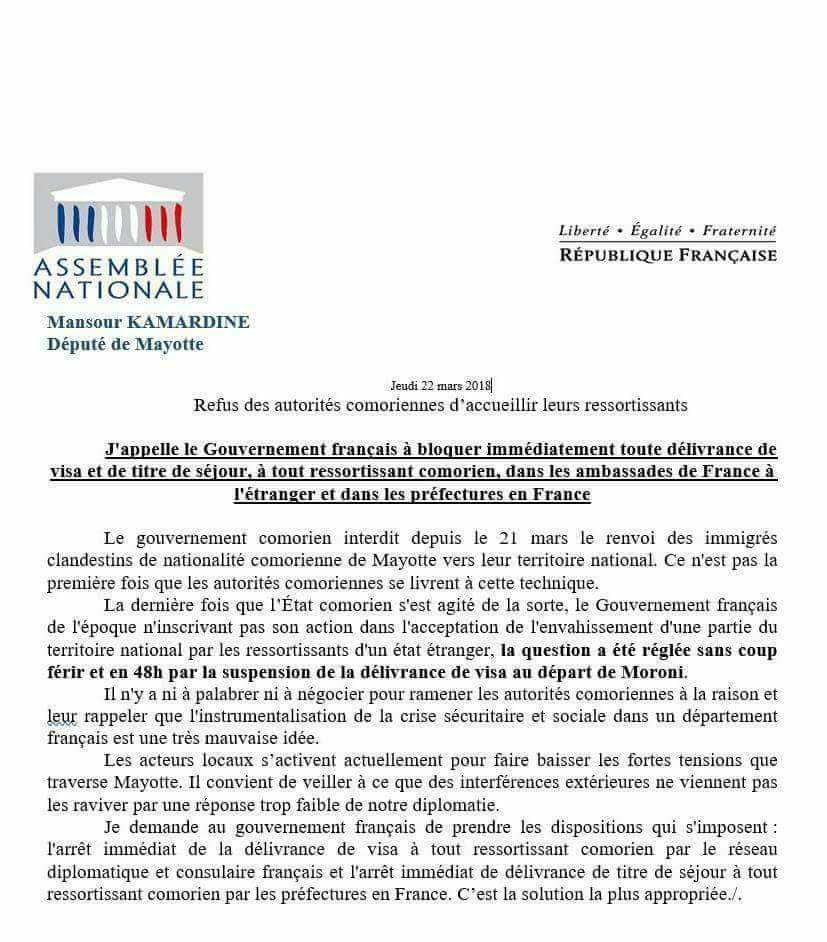 "J'appelle le Gouvernement français à bloquer immédiatement toute délivrance de visa et de titre de séjour, à tout ressortissant comorien, dans les ambassades de France à l'étranger et dans les préfectures en France