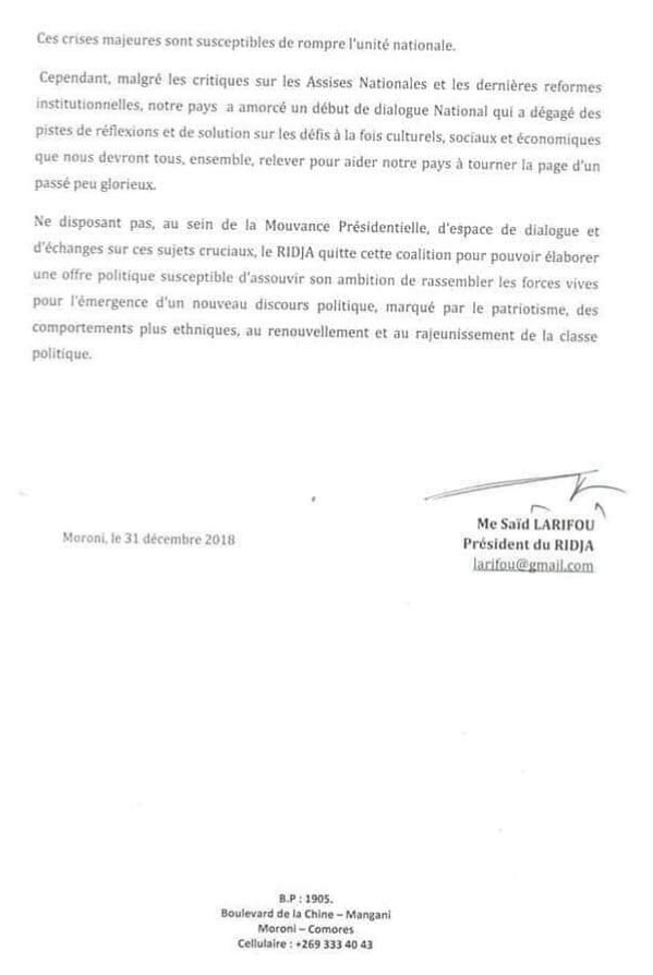 C'est dans un communiqué parue le 31 décembre 2018 où le président du parti Ridja, Maître Said Larif, a montré sa frustration de quitter la mouvence présidentielle.