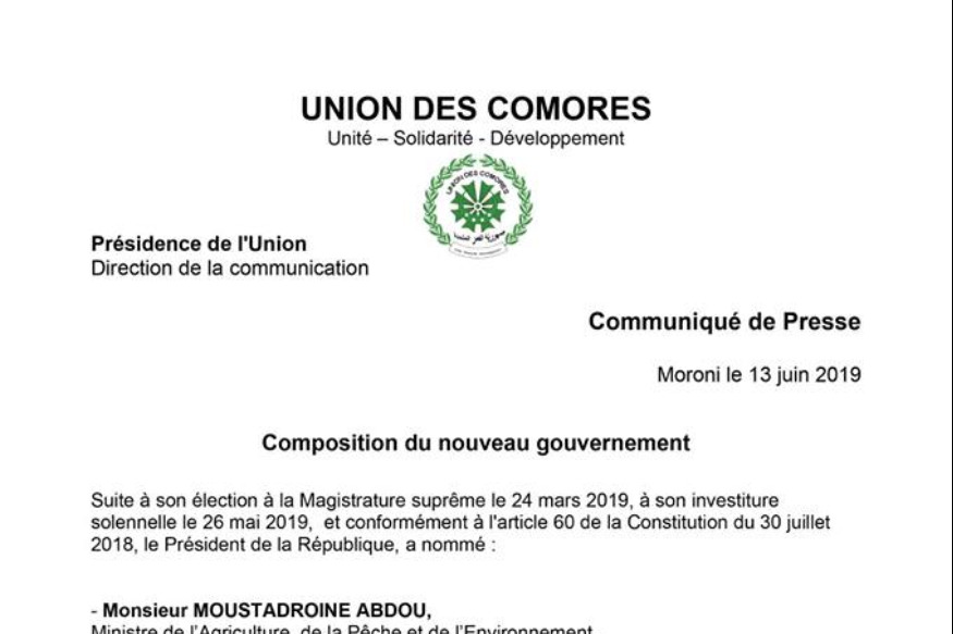 Le président Azali Assoumani vient de nommer les ministres et secrétaires d'état de son nouveau gouvernement. Il réunira le premier Conseil des Ministres de cette nouvelle magistrature, ce mercredi 19 juin 2019, au Palais Présidentiel de Beit-Salam.