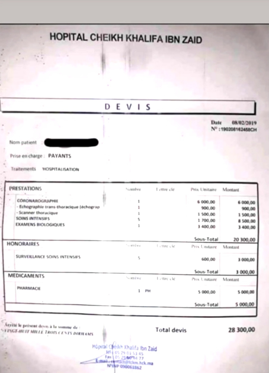 Contacté par la rédaction d'Afrimaghreb, le patient s'est plaint: "selon les médecins, mon cœur ne fonctionne pas comme il le faut. Je souffre d'une insuffisance de rythme cardiaque. J'ai demandé d'avoir un devis de ce que je doit payer pour recouvrir ma santé. Pour tous les frais du traitement, il me faudra la somme de 23800 Dh (1 291 723 francs comorienNDLR) [....] "