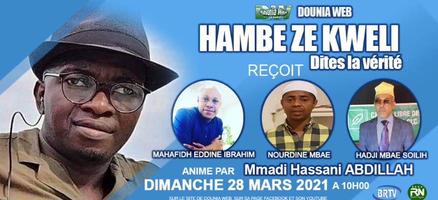 ce dimanche 28 mars 28/03/21 à 10h00 sur Dounia Web et ces médias partenaires Brtv, Radio Ngazi