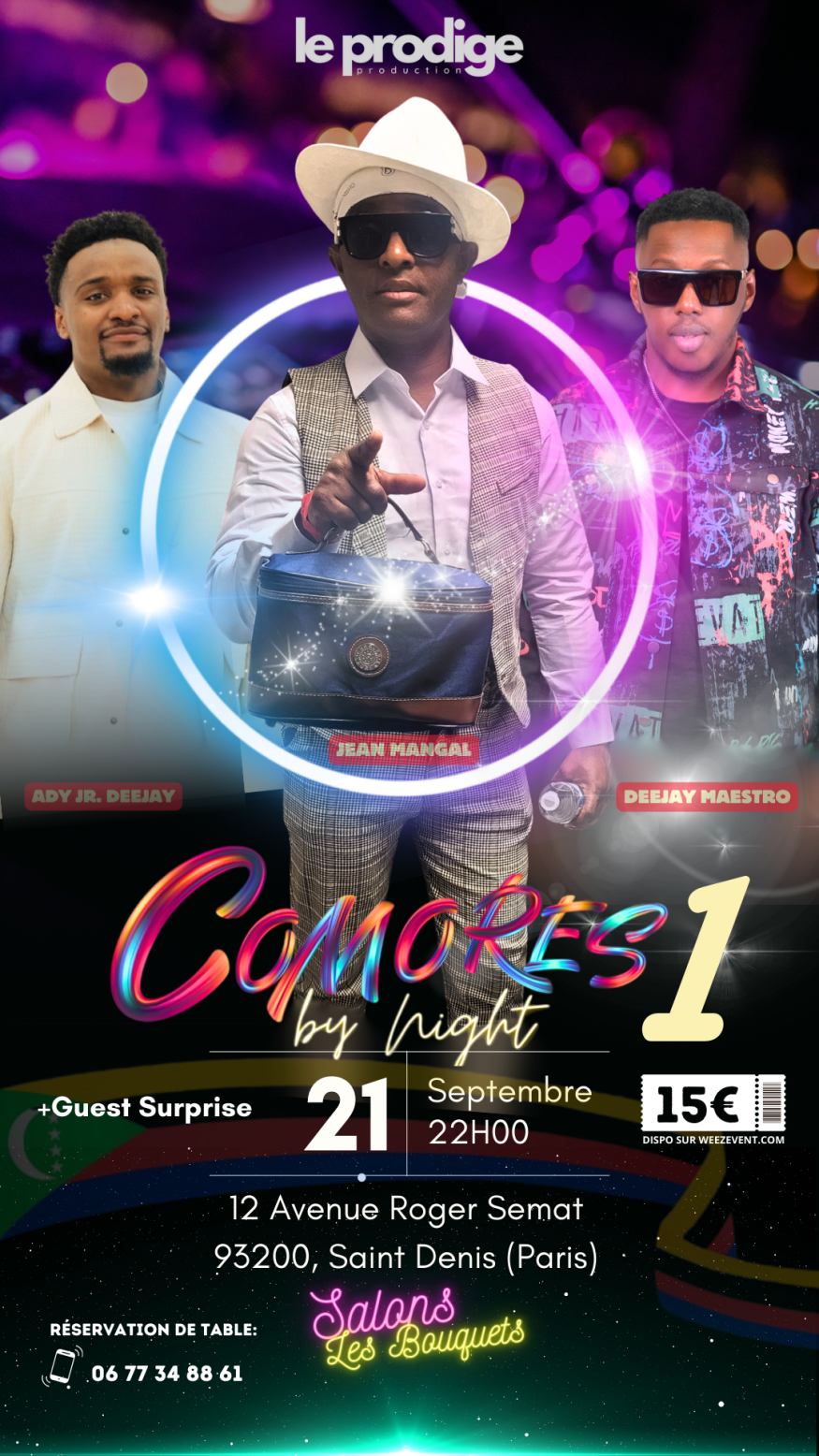 Le Prodige Production vous présente "Comores by Night 1", le grand événement de l'année 2024 avec l'artiste de renom Jean Mangal, qui interprétera son titre "Ndé Secret" ainsi que ses autres tubes.