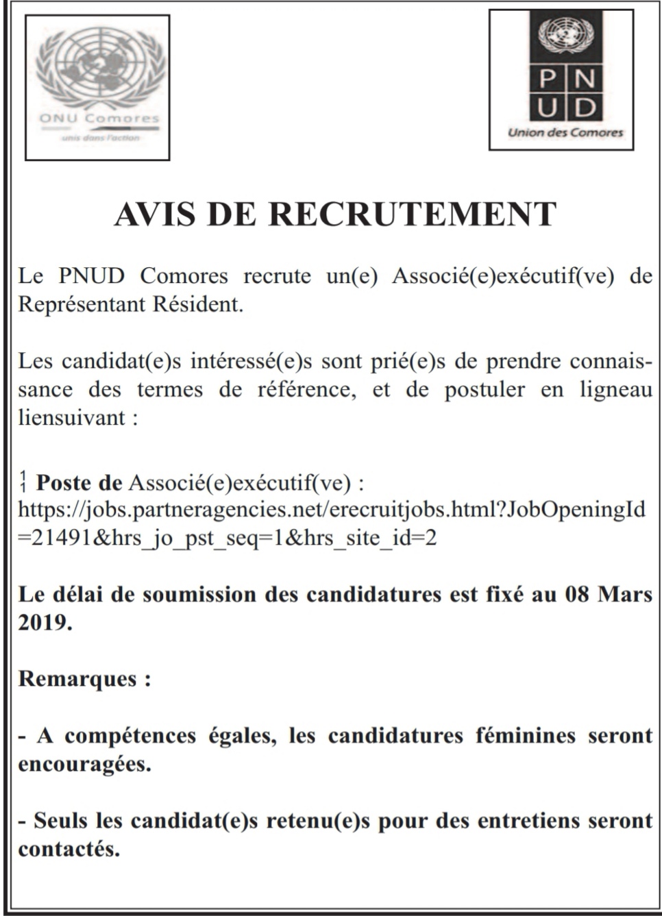 Le programme des nations unies pour le développement auprès de l'union des Comores recrute recrute un(e) associé(e) exécutif(ve) de Représentant de Résidents.
