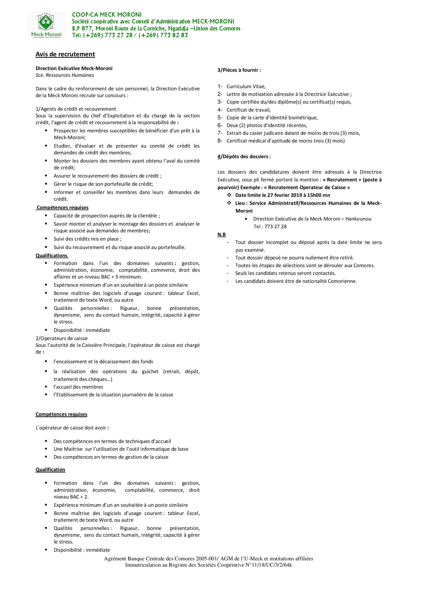 Dans le cadre du renforcement de son personnel, la Direction Exécutive de la Meck Moroni recrute sur concours :